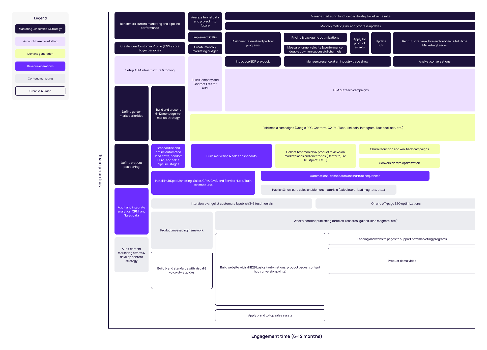 During a full-service engagement, Orsaas’s marketing team designs and executes complete go-to-markets for our clients. Although every company is different, here is a rough idea of what a 6-month engagement could look like.