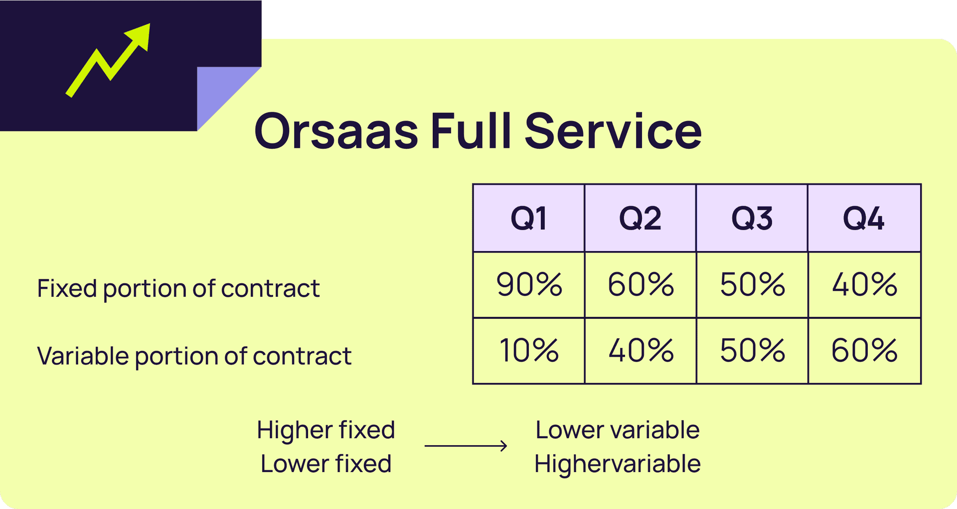 Orsaas uses quarterly Objectives and Key Results (OKRs) to measure performance. The better our team performs against the OKRs, the more of the variable portion of the contract we retain. This can be as low as 0% and as high as 125%.